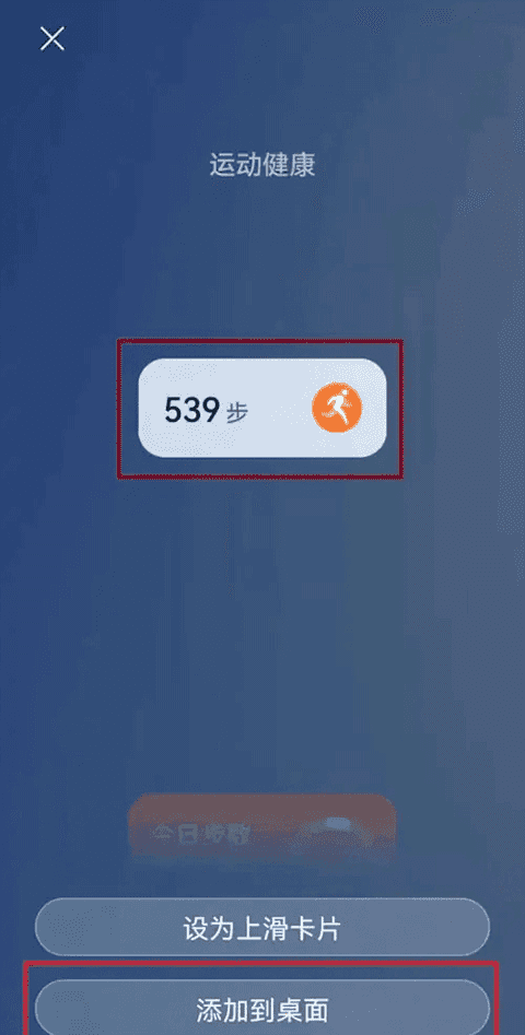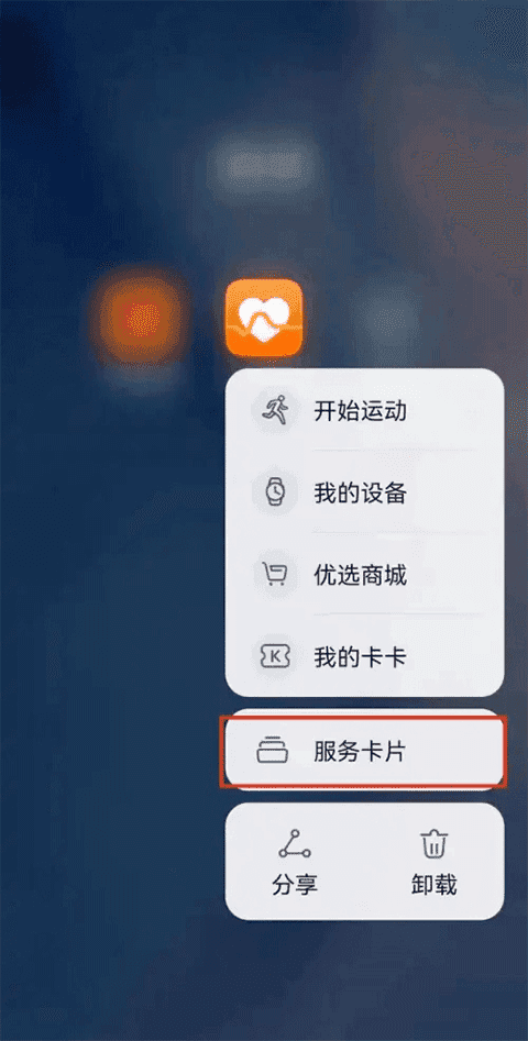 1、在手机上,长按右键运动健康应用,选择服务卡片”。