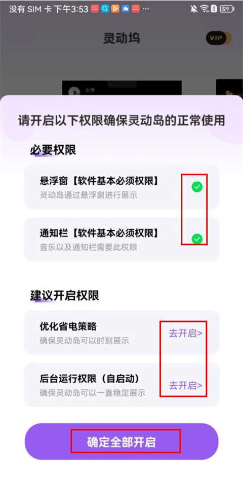 2、按照提示进行相关权限设置,点击【全部开启】确认授权。