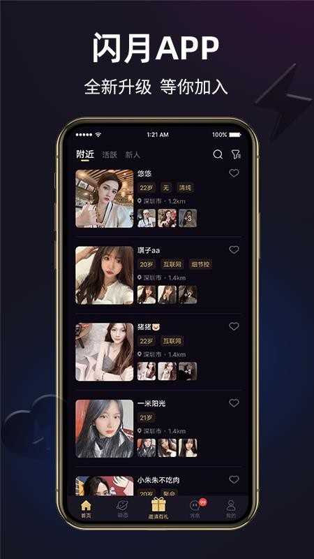 闪月交友是一款专注于同城社交的手机应用,致力于打造真实、高效的交友体验。系统会根据位置信息为用户推荐附近的优质好友资源,所有展示的信息均真实可信。首页设有多个分类栏目,包括附近、推荐和新人专区,方便用户快速找到感兴趣的交友对象。