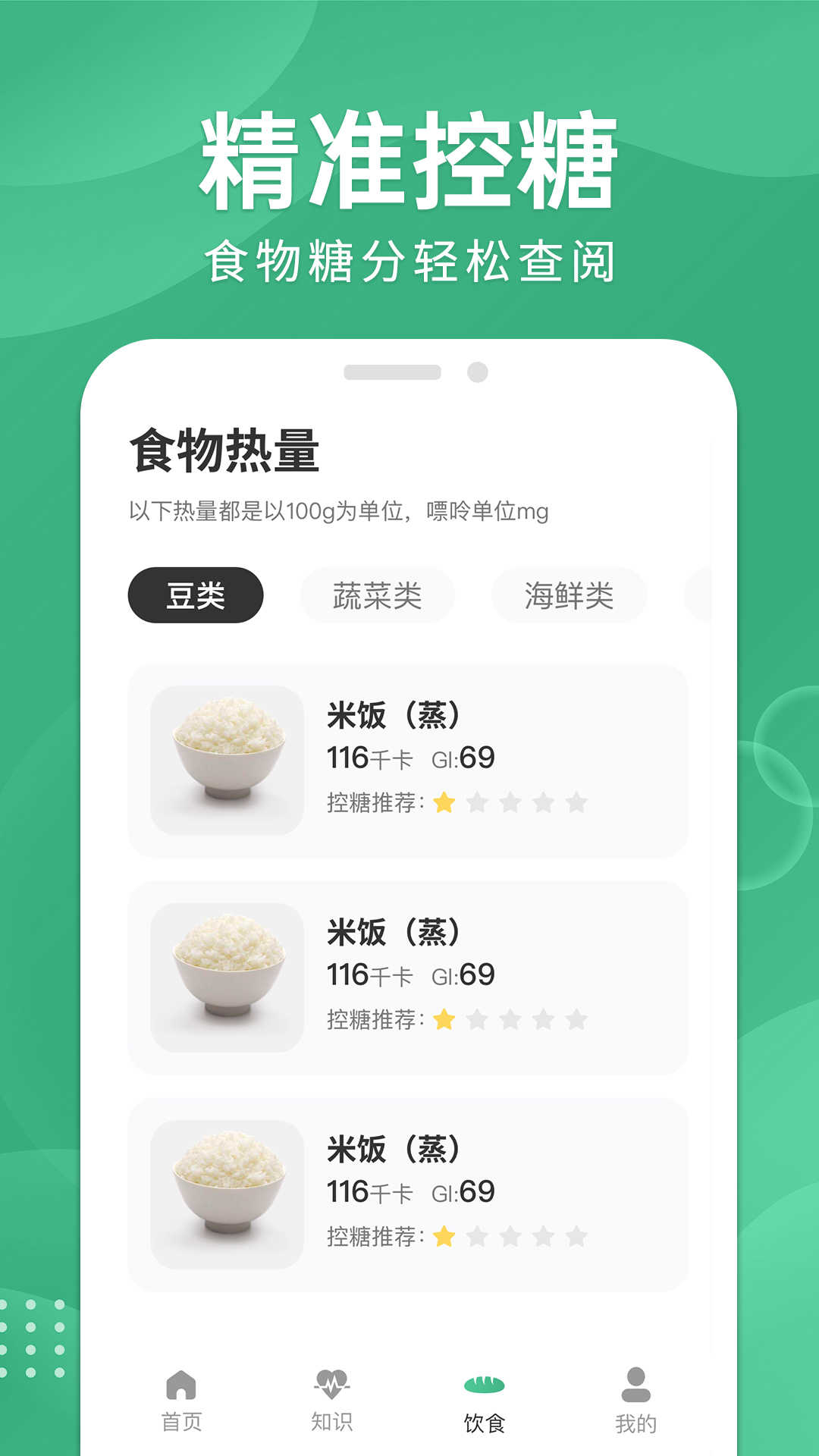 3、食物热量对照,齐全的食物种类,标注好热量及控糖饮食推荐指数,方便隐私管理。