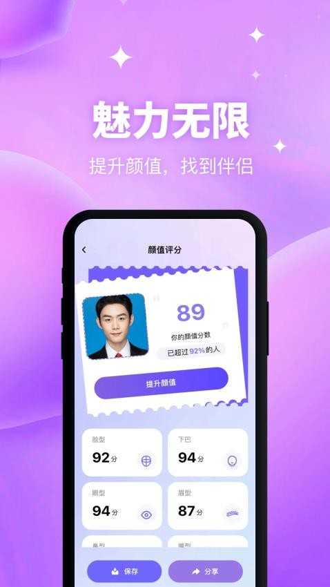 一键测试,即可获得颜值评分,并能根据情况提供专业建议;