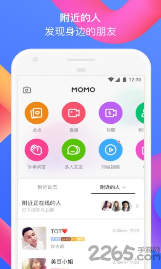 1、打开陌陌交友app,点击开启定位功能。系统会自动推荐附近用户,滑动查看个人资料,点击头像即可发送打招呼消息。