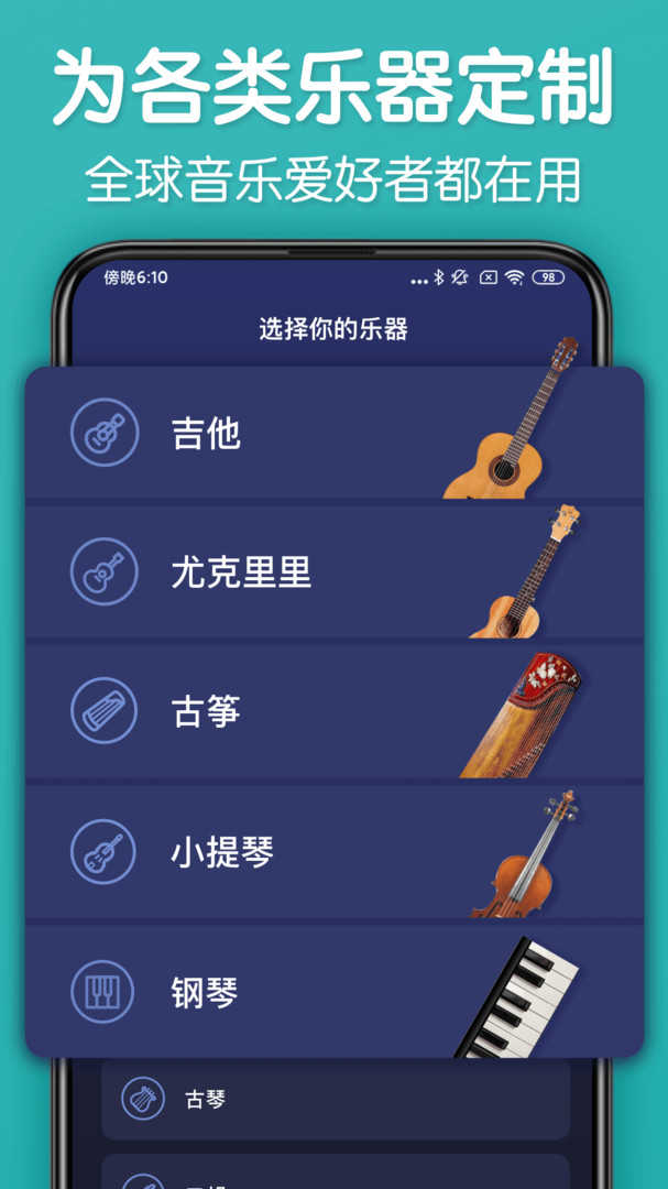 2、根据适用乐器不同,软件分为吉他调音器、古筝调音器等。