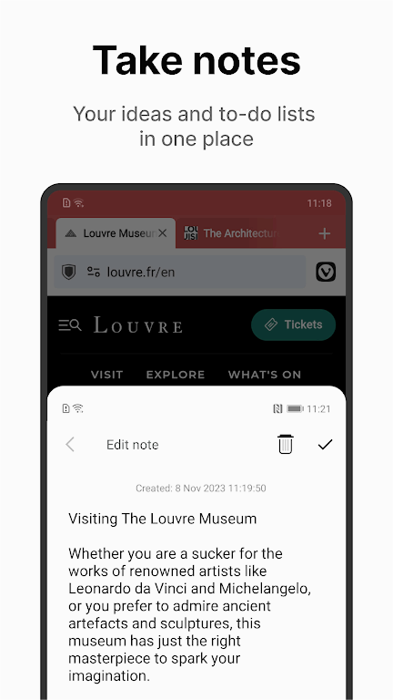 Vivaldi轻松改变您在网络上的日常互动。借助Vivaldi独特而强大的工具-笔记-您甚至可以在手机上保持领先。这是其他浏览器没有内置的东西。