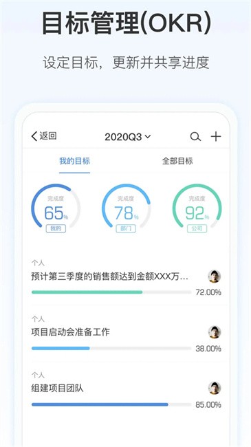 2、通过目标管理模块设定季度关键指标,将目标与具体任务关联,系统会自动计算完成度并生成进度分析报告。