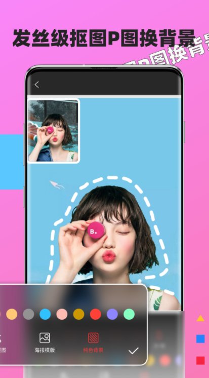 2、抠图神器 发丝级抠图神器,一键抠出所需人物 ,马卡龙色 切换背景 横屏拍摄 有趣圆形视角。