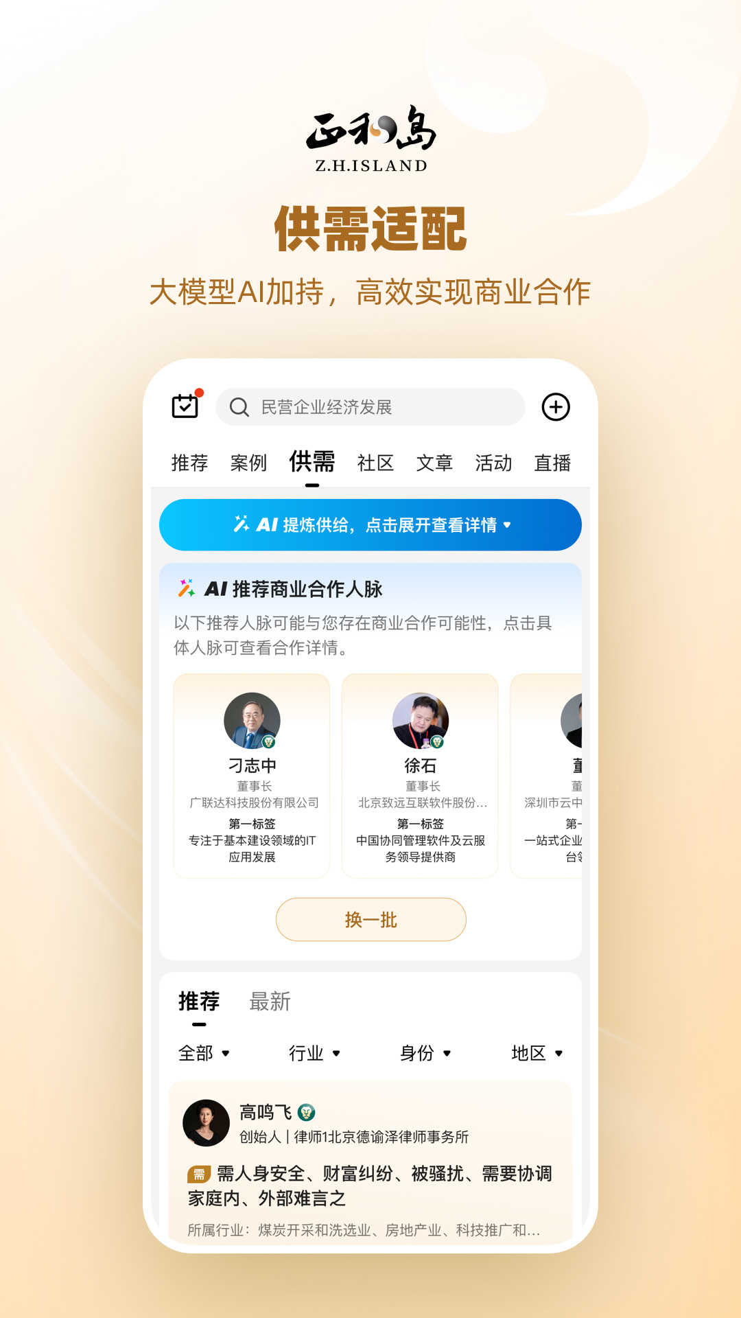 正和岛是一款专注于企业家及创业者的高端人脉与网络社交平台,由中国企业家俱乐部创始人、《中国企业家》杂志原社长刘东华先生创办于2011年。该平台以供需适配为核心价值,致力于通过信任链接提供精准、高效、可信赖的供需适配服务,降低资源对接与商业合作的成本,助力中国企业实现优势互补、互利共赢。
