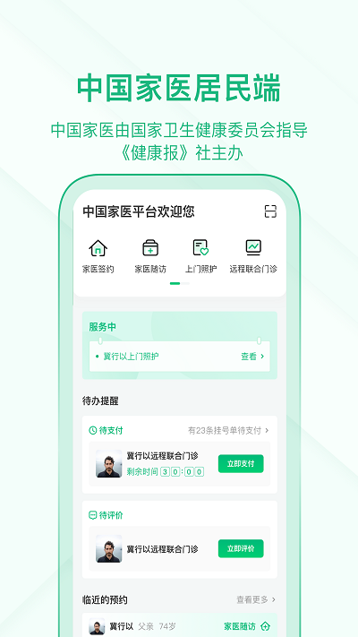 中国家医居民端在国家卫生健康委员会基层卫生司指导下,由《健康报》社负责组织开发运营的、面向全国家庭医生签约服务的统一权威的互联网信息平台。