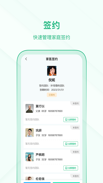 1、首页:可查找“离我最近”和“离家最近”的医疗机构、找到自己想签约的医生团队,进行签约申请。还可看到为您推荐的资讯。