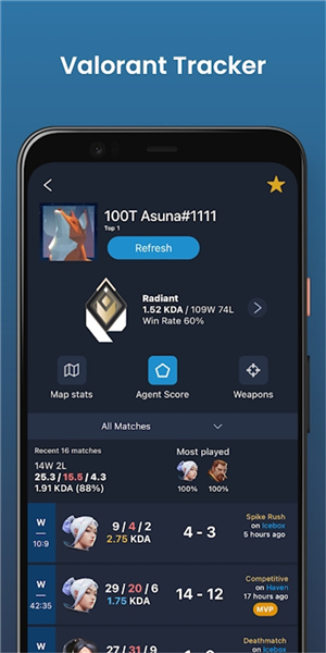 1、您可以查看任何地区的官方Valorant排行榜,也可以查看任何公开个人资料玩家的详细信息和统计数据。