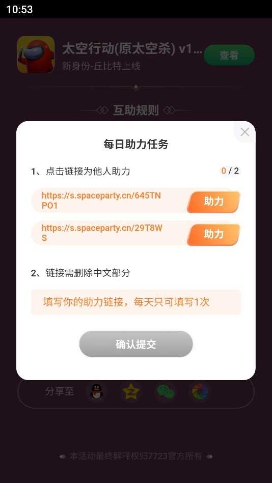 1、每名玩家需点击助力3次之后,才能提交自己的助力链接。