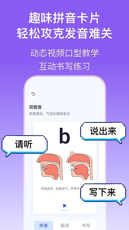 1、软件采用动态视频口型示范拼音读法,将发音过程进行可视化展现,让学习者能够清晰观察唇舌位置与气流变化。