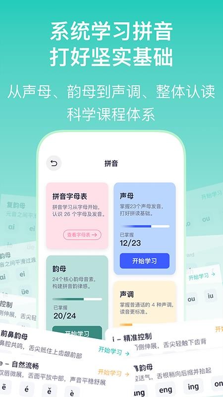 2、真正实现从零起步的教学引导,即使没有任何拼音基础的用户也能通过直观课程轻松入门,逐步建立发音与拼写的概念关联。