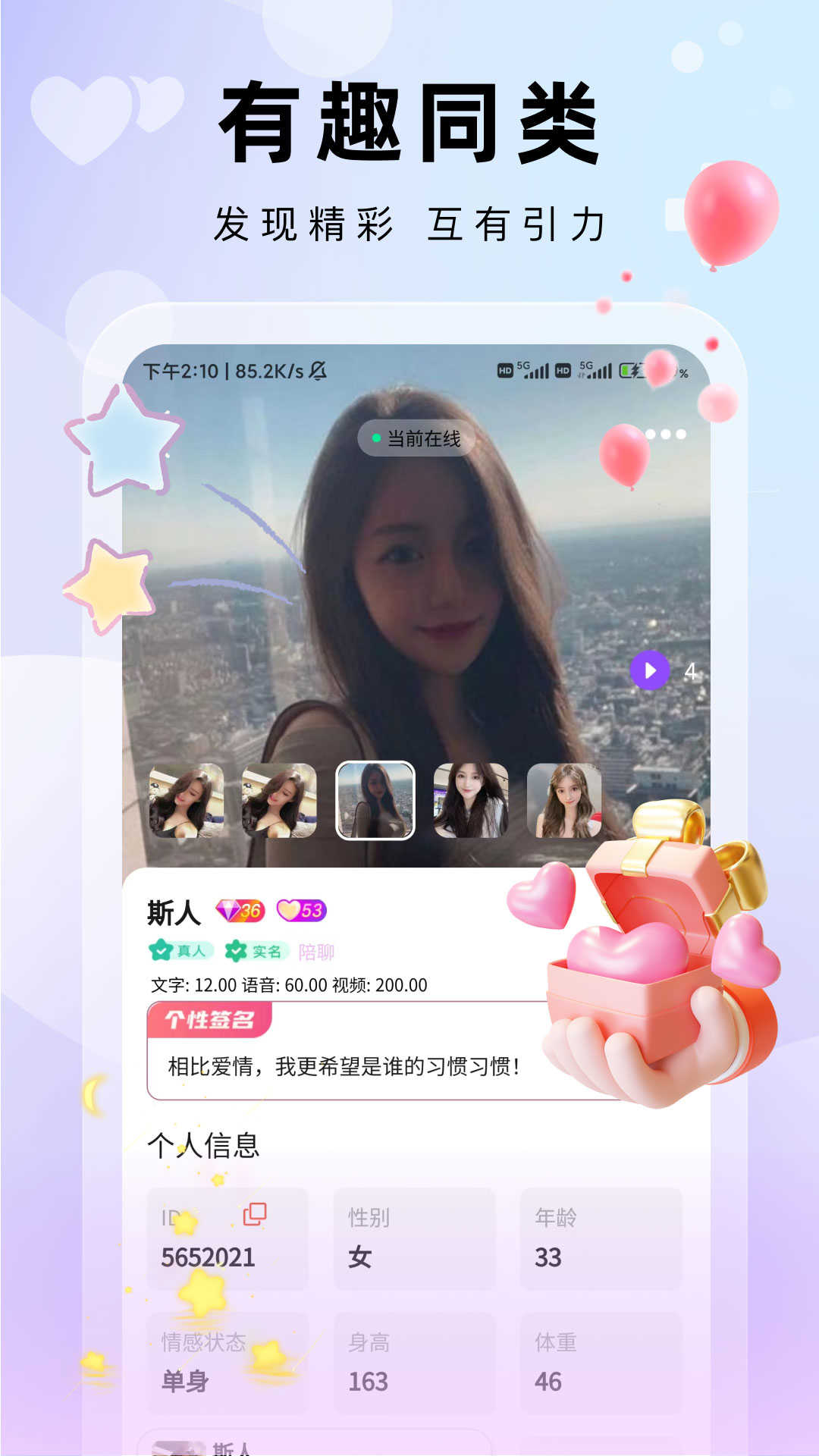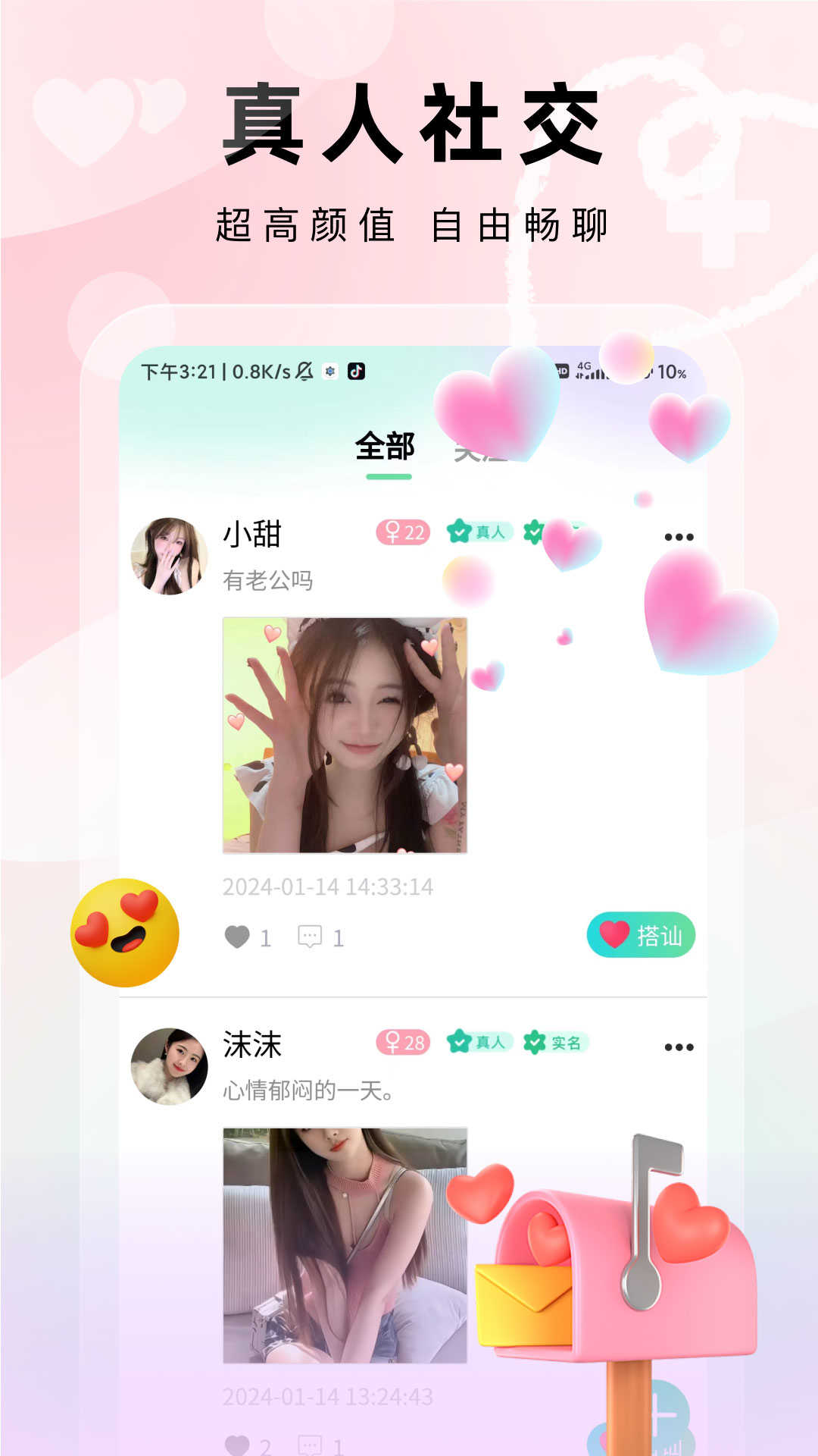 见吗交友正版打造了一个全新的社交天地,在这里你可以自由结识新朋友,展示真实的自我。每位用户都可以发布动态,分享自己的兴趣爱好和生活片段。更重要的是,这里的用户都经过严格的身份认证,确保信息的真实可靠,让你在交友时更加安心。