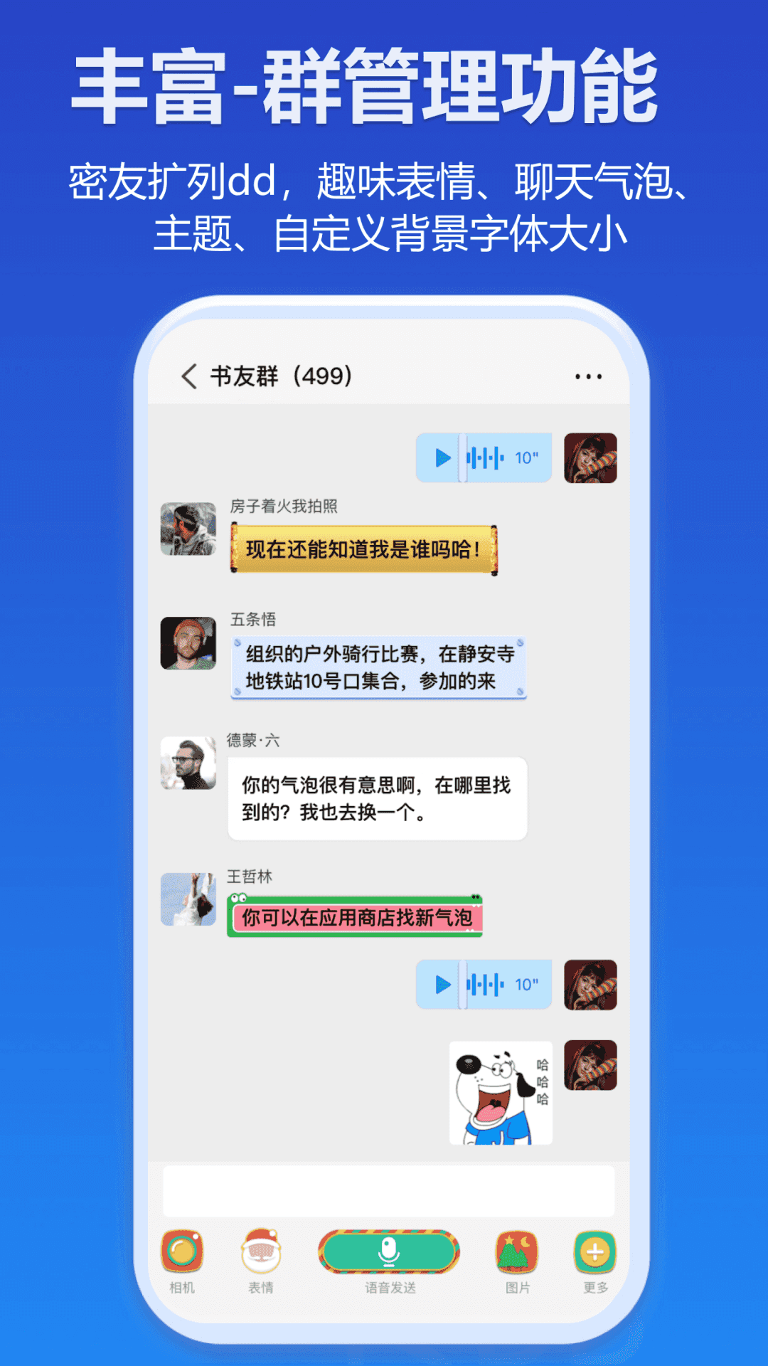 【聊天】提供文本,语音,图片,视频,名片,位置,表情,视频语音通话,群组,阅后即焚