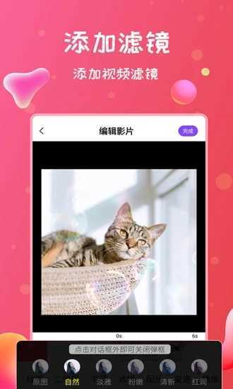 编辑特效:日系、复古、黑白、摩登、胶片等个性滤镜,动态文字、大片片头、趣味贴纸、真实音效素材。