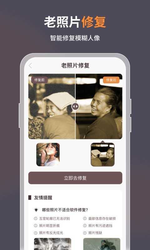 智能修复老照片是一款实用的老照片修复处理工具软件,软件能够充分为用户进行老照片的修复。采用多种方式来修复,让各位的证件照、结婚照等变得更加清晰。海量的修复功能,能够满足用户的各种修图需求,快来下载吧!