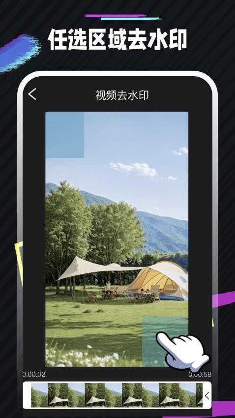1、视频上面去除水印框选择视频上水印所在的区域,智能去除水印,简单易操作
