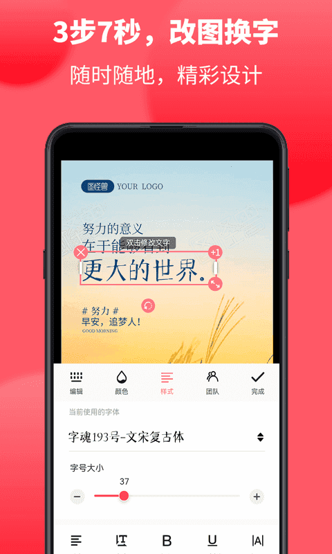 只需改字换图,3步7秒,手机一键出海报。无门槛做图做视频,从此设计不求人。