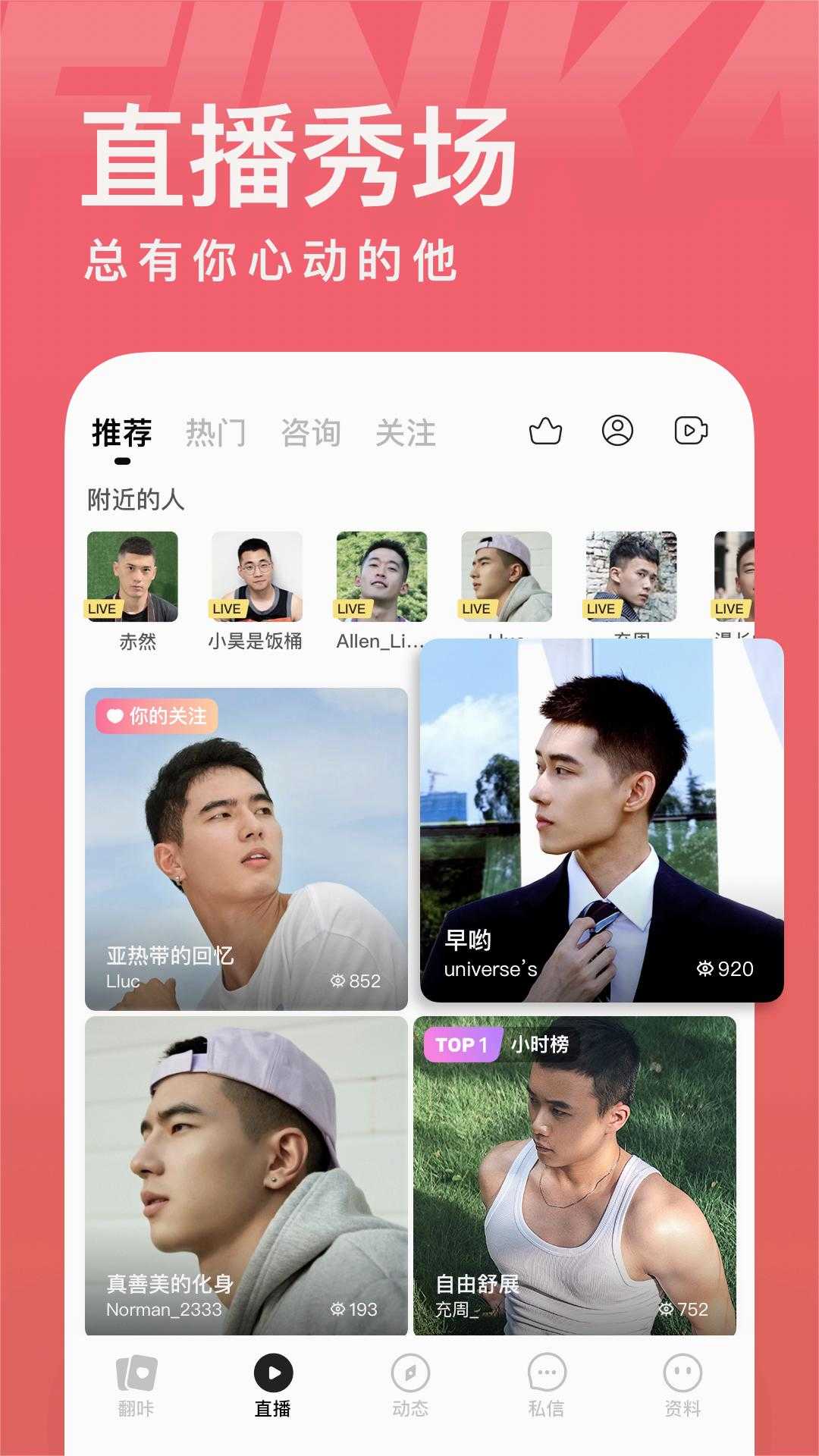 3、打开翻咔就能看到高颜值的主播,随时做好心动的准备