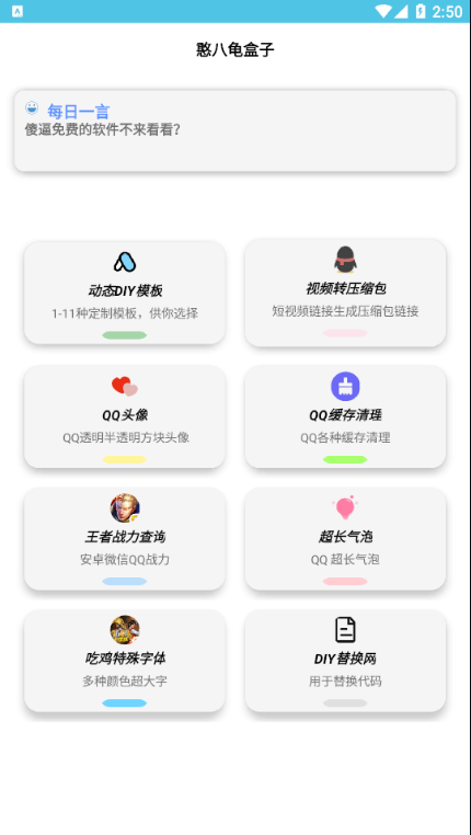 憨八龟盒子是一款集合多种实用功能的工具箱软件,不仅为游戏玩家提供了详尽的游戏资讯和专属工具,还涵盖了丰富的系统辅助功能。无论是游戏动态的追踪还是个性化设置的需求,用户都可以通过这款软件轻松实现。此外,它还支持头像气泡自定义、特殊字体应用等功能,尤其适合喜欢探索和定制的游戏玩家。