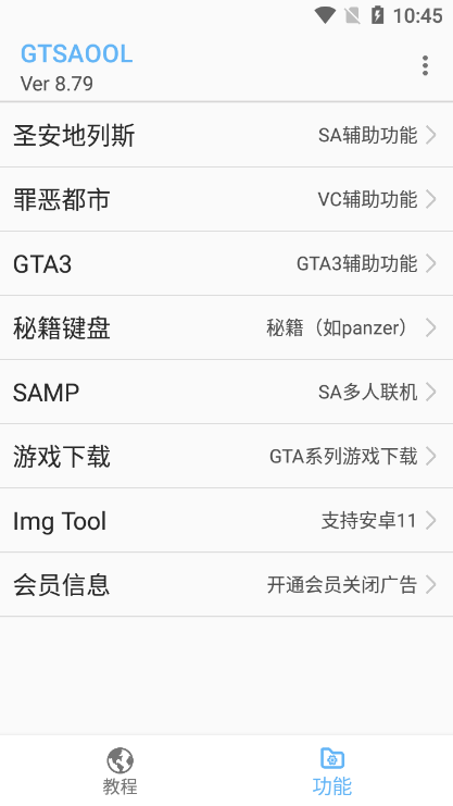 3、一款为玩家量身打造的手游辅助软件,集合了众多GTASA核心辅助功能,助你畅享游戏乐趣。