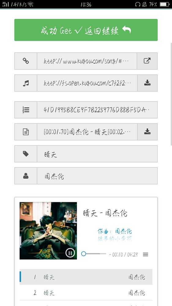 4、有下载地址和音乐链接,还可以同时下载歌曲,下载后直接到播放器导入即可。