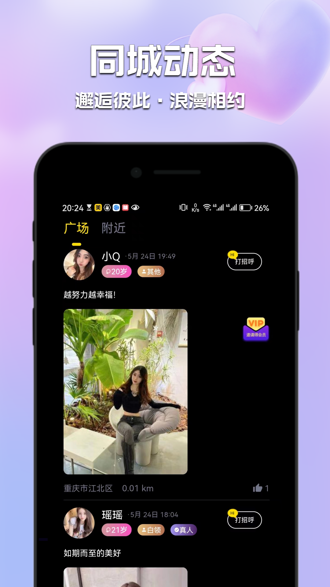 1、基于LBS地理位置服务,精准显示附近用户的动态信息,快速找到心仪的TA;