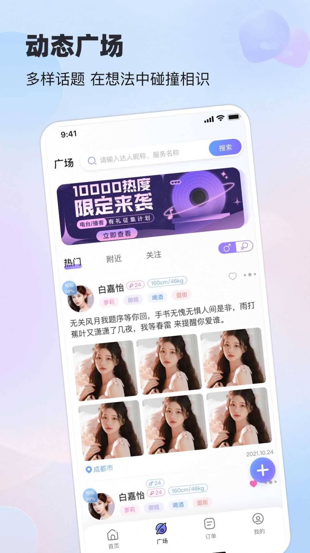 2、动态广场丰富话题,激发灵感,让用户自然相识。