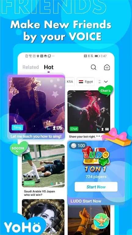 YoHo语音是一个专为年轻人打造的高效社交平台,告别单调的传统交友模式,带来充满活力、简约时尚且妙趣横生的互动体验。每天都有意想不到的惊喜等待着你去发现,让陌生关系逐步转化为知心好友、亲密伴侣甚至灵魂知己,开启一段段美妙的旅程。