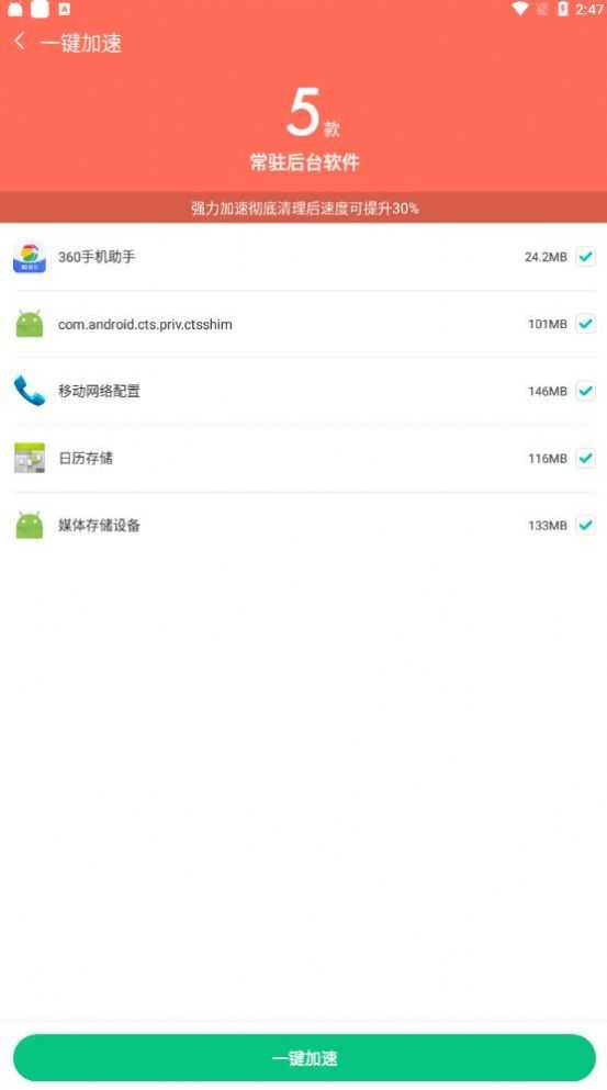 1、提供手机加速功能,可一键提升手机运行速度;