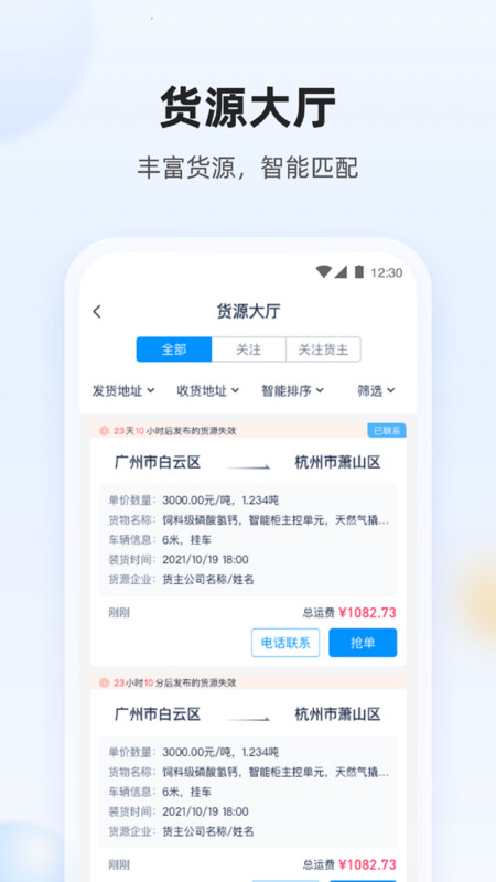 3、在首页选择"货源大厅",查看智能匹配的货源信息。