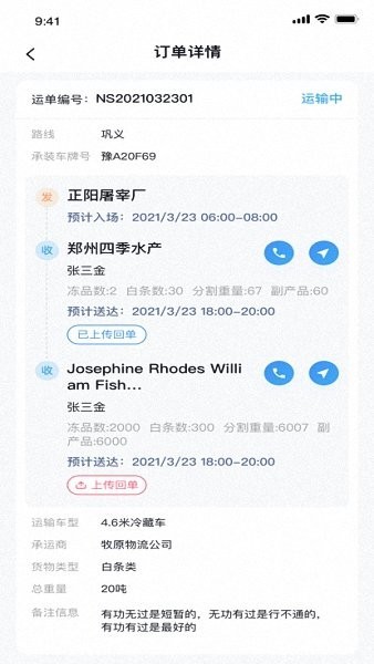 3,装货前记得点击开始运输并核对温控设置,途中要定期检查车厢温度。到达目的地前可通过软件联系收货方。
