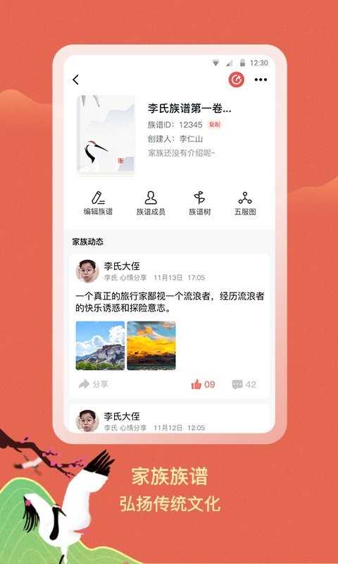 在这里你可以通过族谱记录、传承你的家族,记录更多家族事件。也能帮助你轻松连接亲朋好友;