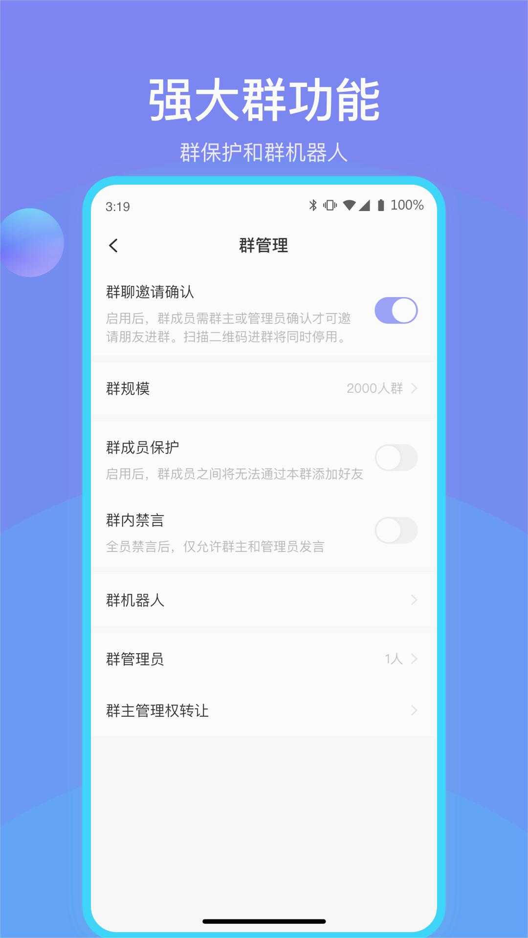 8、群机器人功能:群主可自定义设置群机器人,方便进群欢迎,回复消息,发送群消息。