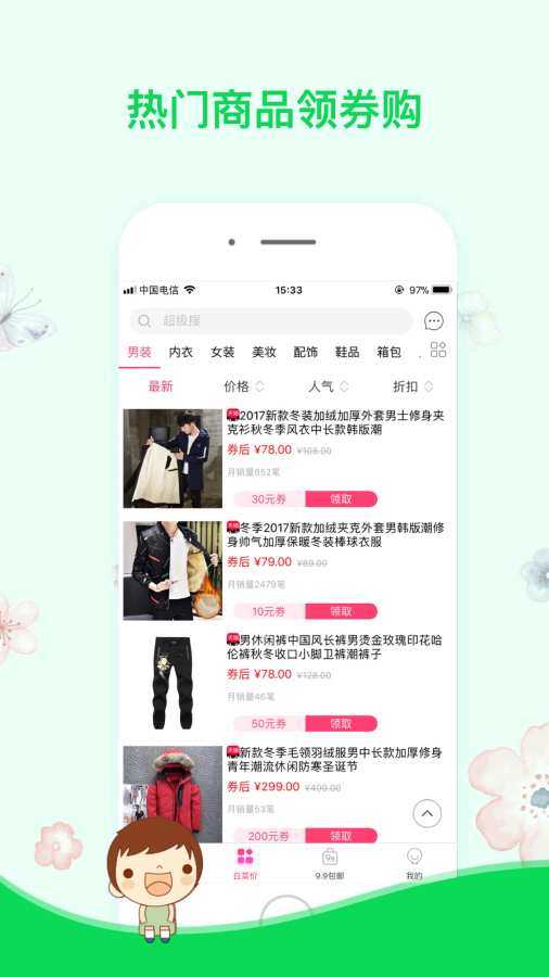 3、汇集众多旗舰店知名品牌内部券、9块9包邮、限时特卖,白菜不单单是便宜,而是超值,超性价比,买到就是赚到。