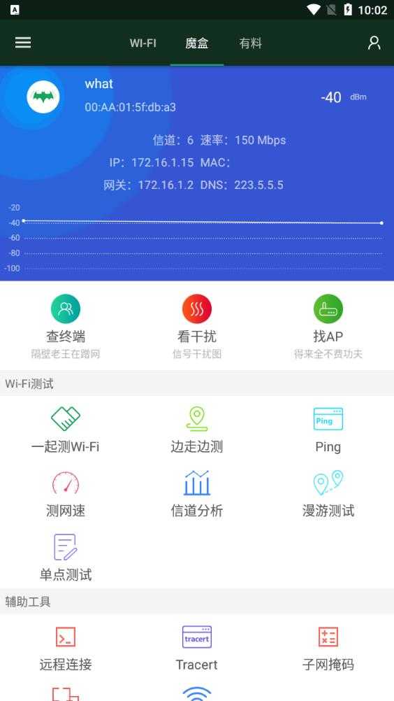 【魔盒】这里还有集成很多无线专业工具,再也不用四处寻找。漫游测试、ping、扫一扫、测网速、单点测试、telnet、蓝牙遥控,你想要的应有尽有。