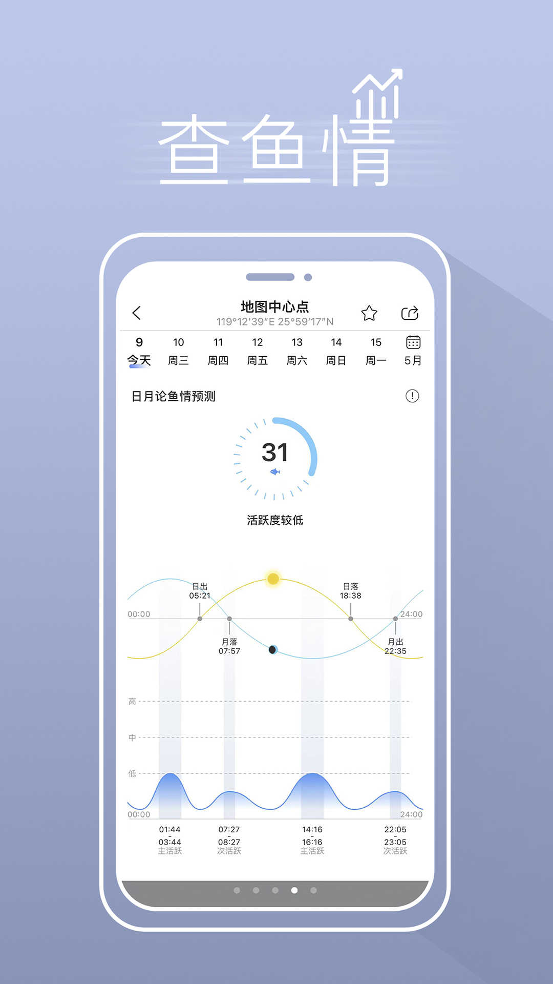 支持一周内天气查询和海况预报,直观并详尽地展示一天之内每隔1个小时的天气状况,包括温湿度、气压、降水量、风向、风力、浪高等内容。根据季节、日照时间、潮汐情况以及月相共同作用得出鱼类活动趋势,为用户的出行计划提供参考。