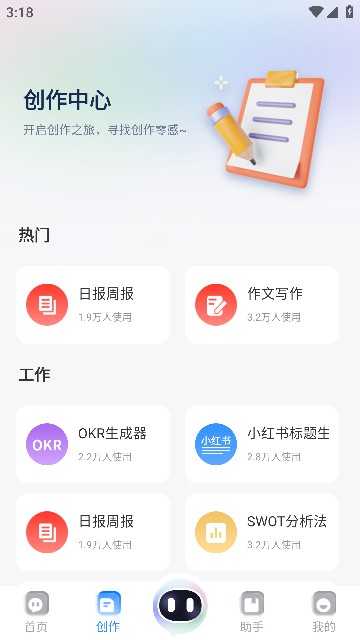 1、根据用户的历史记录和偏好,智能推荐创作主题、写作素材、创意思路等,帮助用户更好地完成创作任务。