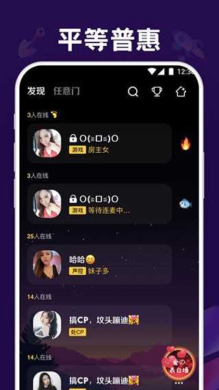 3、这里聊天全部都是通过语音来社交的,可以听到各种不同的音色,在这里社交不看脸;