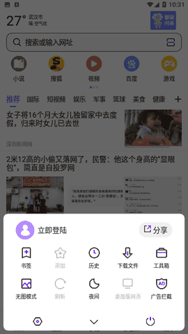 1、内置多种实用工具:隐私浏览、桌面版、主题切换、二维码扫描……浏览器该有的工具我们都有。