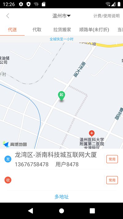 3、在首页选取代送取等类型并填写地址,提交服务需求。