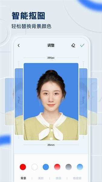 2、还有美颜滤镜功能,不用担心证件照不够美。有白红蓝三种底色供你选择,轻触需要的颜色即可换背景,制作美丽又符合要求的证件照。