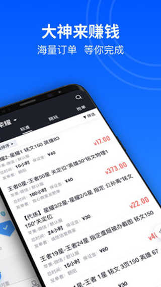 2、接单赚钱:海量代练订单来自各大热门游戏,任君选择,轻松赚钱;