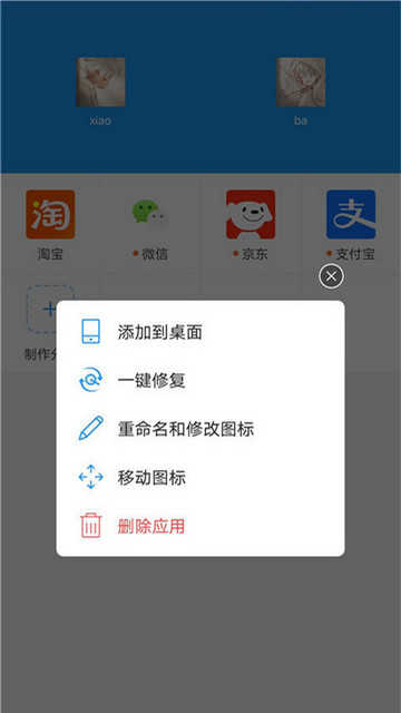 3、长按图标应用程序会弹出可用功能,可以修复游戏中的异常数据,重命名或修改图标等。