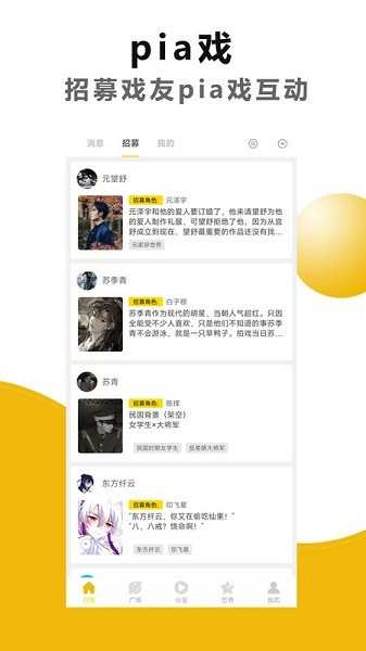 设有角色招募功能,用户可根据兴趣加入剧组进行对戏。
