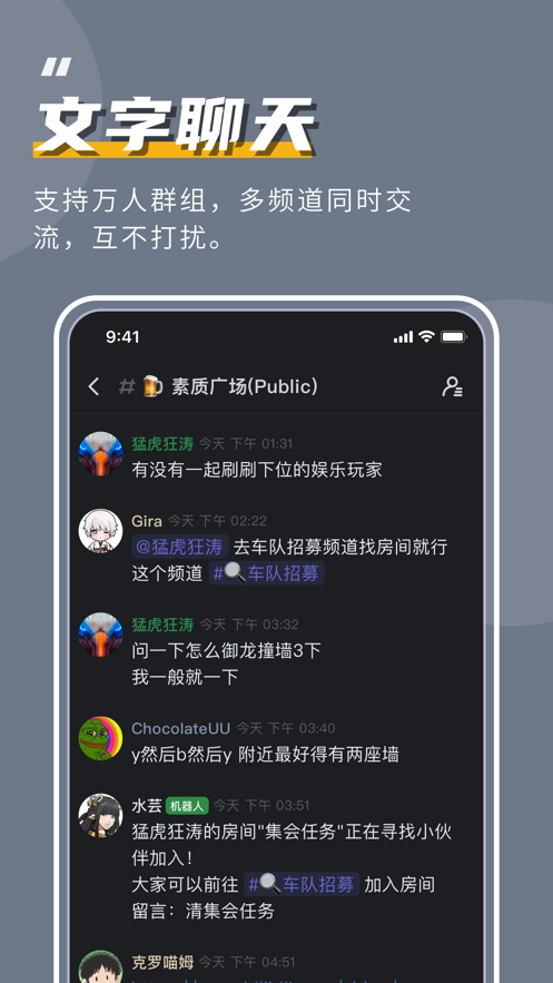 文字聊天:超大文字频道,万人可同时发言,与志趣相投朋友一起畅所欲言。