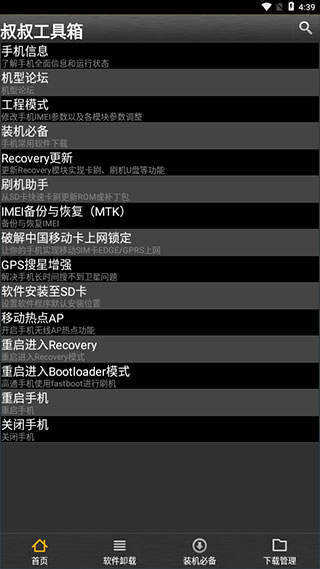 1、移动叔叔工具箱是Android是由Mobile Uncle ROM集团发布的工具软件