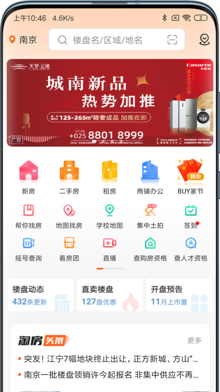 ·海量房源:新房、二手房、租房信息全覆盖,为租房、买房的用户提供楼盘动态、团购报名、看房团报名、楼盘折扣、楼盘优惠,各种购房工具