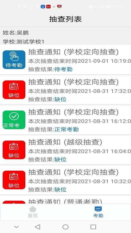 2.学生登录App进行激活测试,收到抽检通知后完成识别,显示学生的抽检记录。